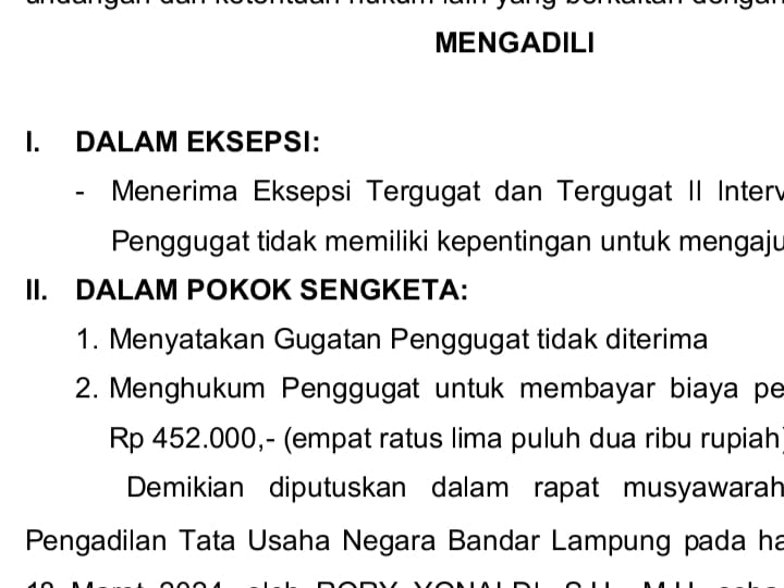 Pengujian dan keadilan tegak lurus bukan hanya di uji di Pengadilan Tata Usaha Negara (PTUN) di Lampung, ada keputusan Banding di Palembang, ada keputusan Kasasi di Jakarta yang menjelaskan bahwa kepala kampung Bumi Ratu atas nama Abdul Malik (AM) sewaktu mengikuti proses pemilihan kepala kampung (pilkakam) pada tahun 2023 dengan mempergunakan ijasah paket B (setara pendidikan formal sekolah menengah pertama atau SMP) di menangkan oleh Abdul Malik (AM).
